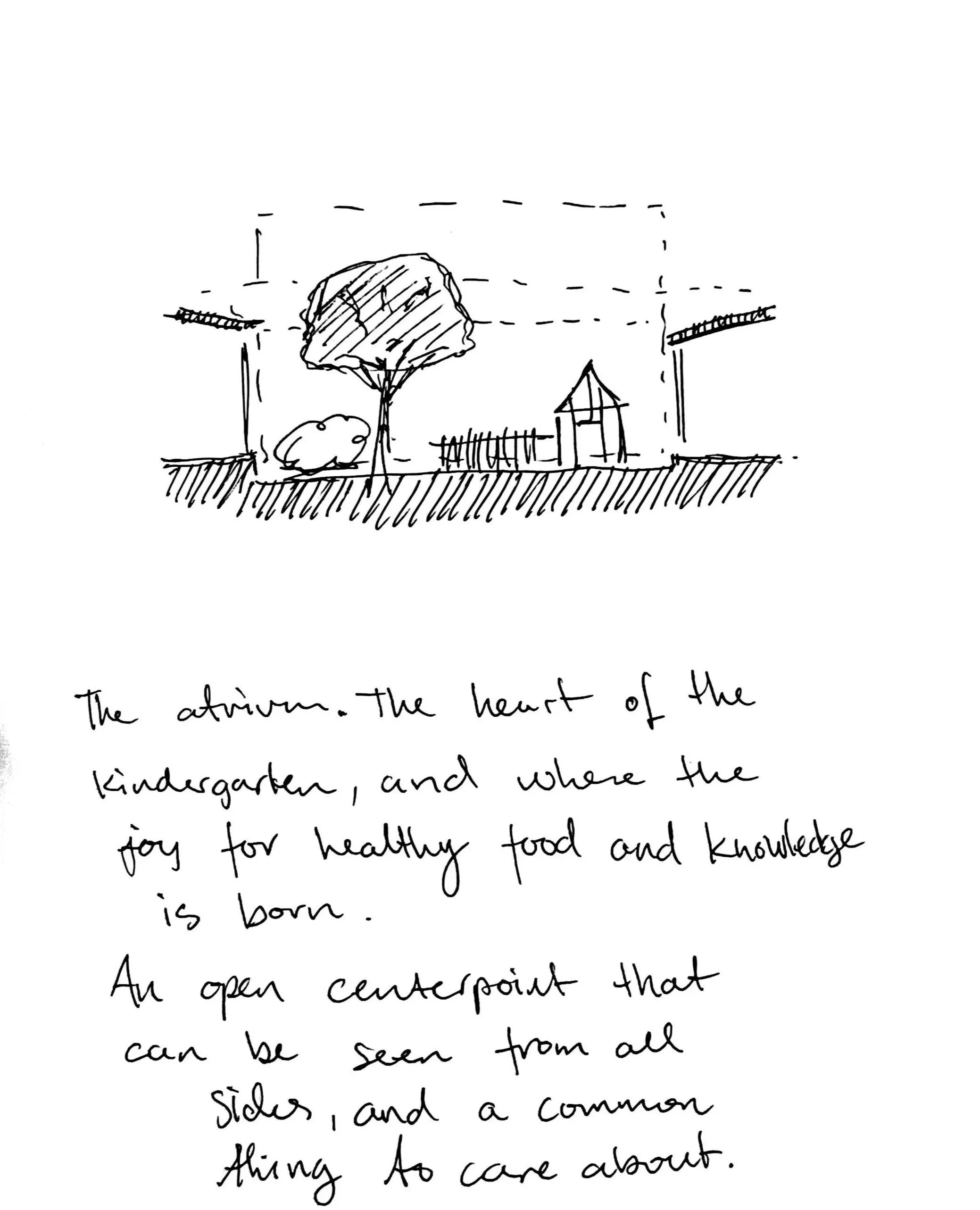 The atrium. The first outdoor layer. An enclosed space that feels known and safe. Here, the kindergarten can grow its own vegetables and berries, to be used in the kitchen.